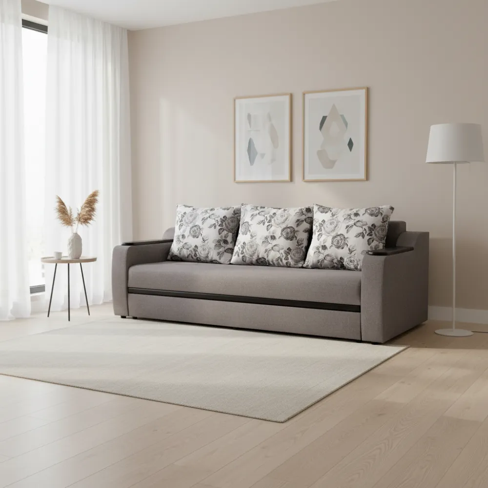 Материал обивки: Ткань. Обивка приятна на ощупь и устойчива к износу, что обеспечивает долговечность и лёгкость ухода. Цвет исполнения — серые — подчёркивает эстетичность модели.