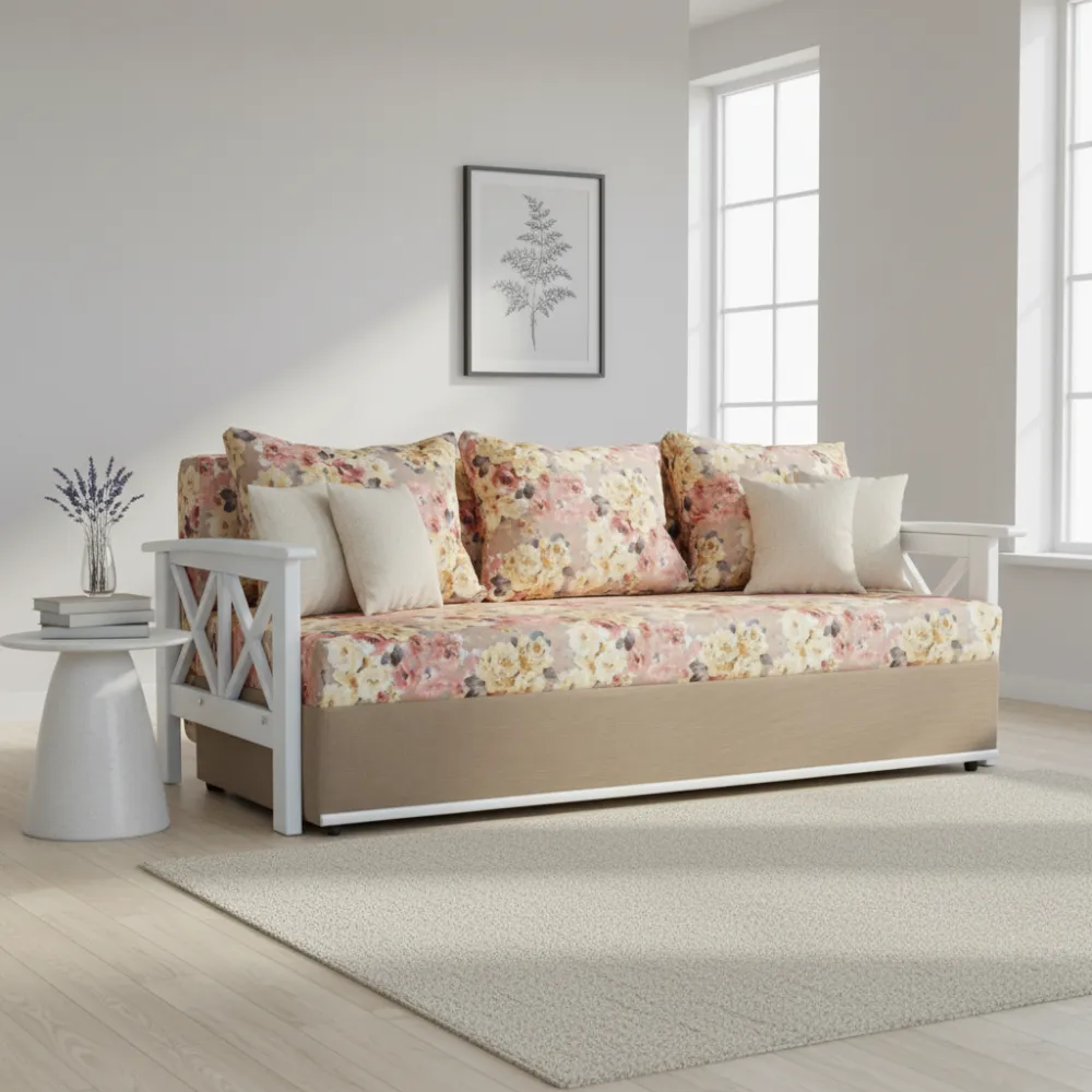 Материал обивки: Ткань; Микрофибра. Обивка приятна на ощупь и устойчива к износу, что обеспечивает долговечность и лёгкость ухода. Цвет исполнения — цветы — подчёркивает эстетичность модели.