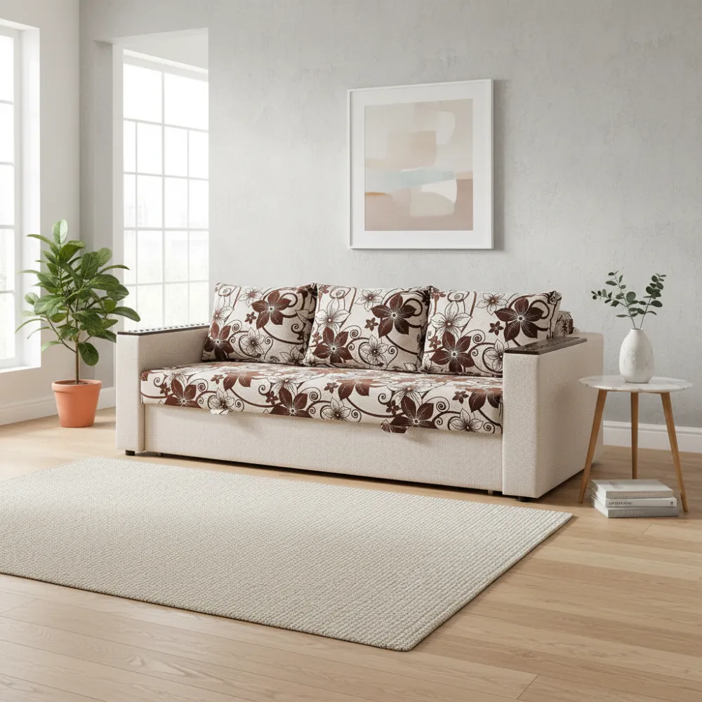 Материал обивки: Ткань. Обивка приятна на ощупь и устойчива к износу, что обеспечивает долговечность и лёгкость ухода. Цвет исполнения — цветы — подчёркивает эстетичность модели.