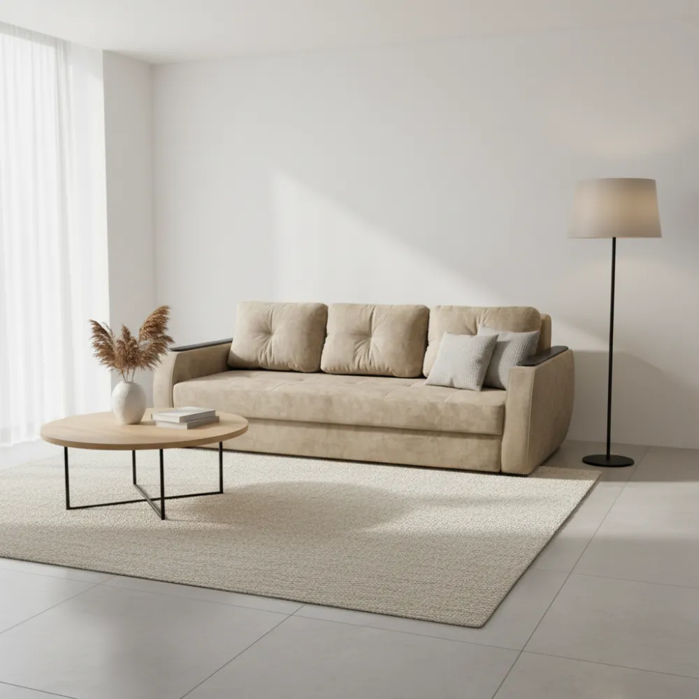 Функциональность: Удобный механизм трансформации позволяет легко превратить диван в полноценное спальное место размером 150x190 см для комфортного отдыха.