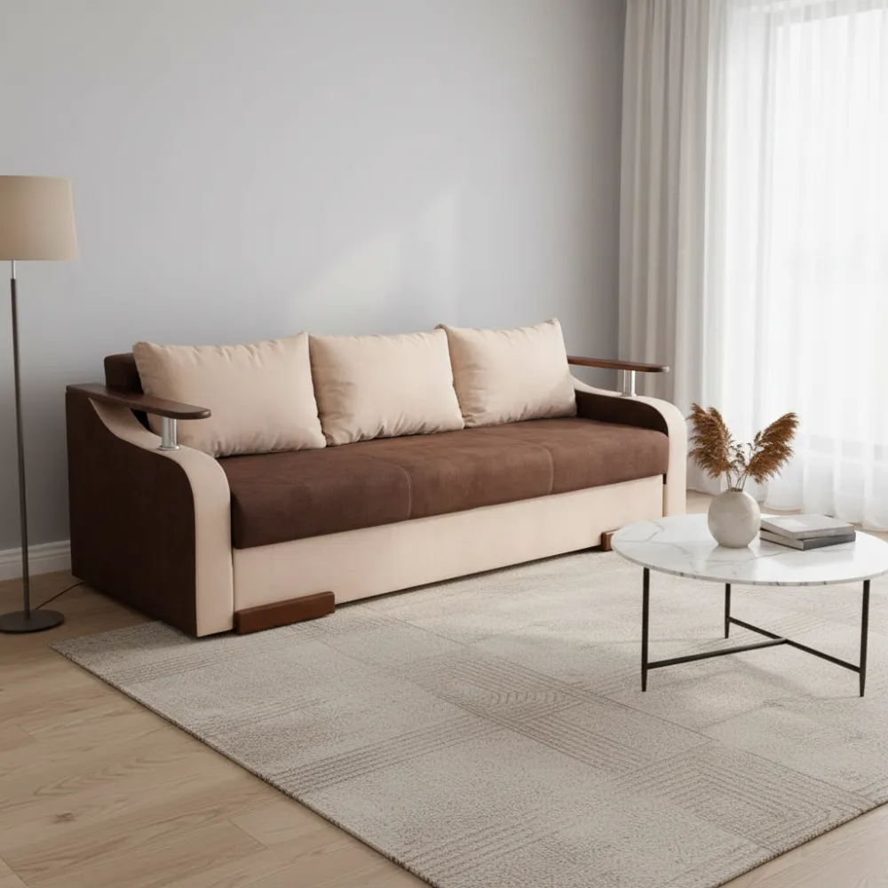 Функциональность: Удобный механизм трансформации позволяет легко превратить диван в полноценное спальное место размером 150x190 см для комфортного отдыха.