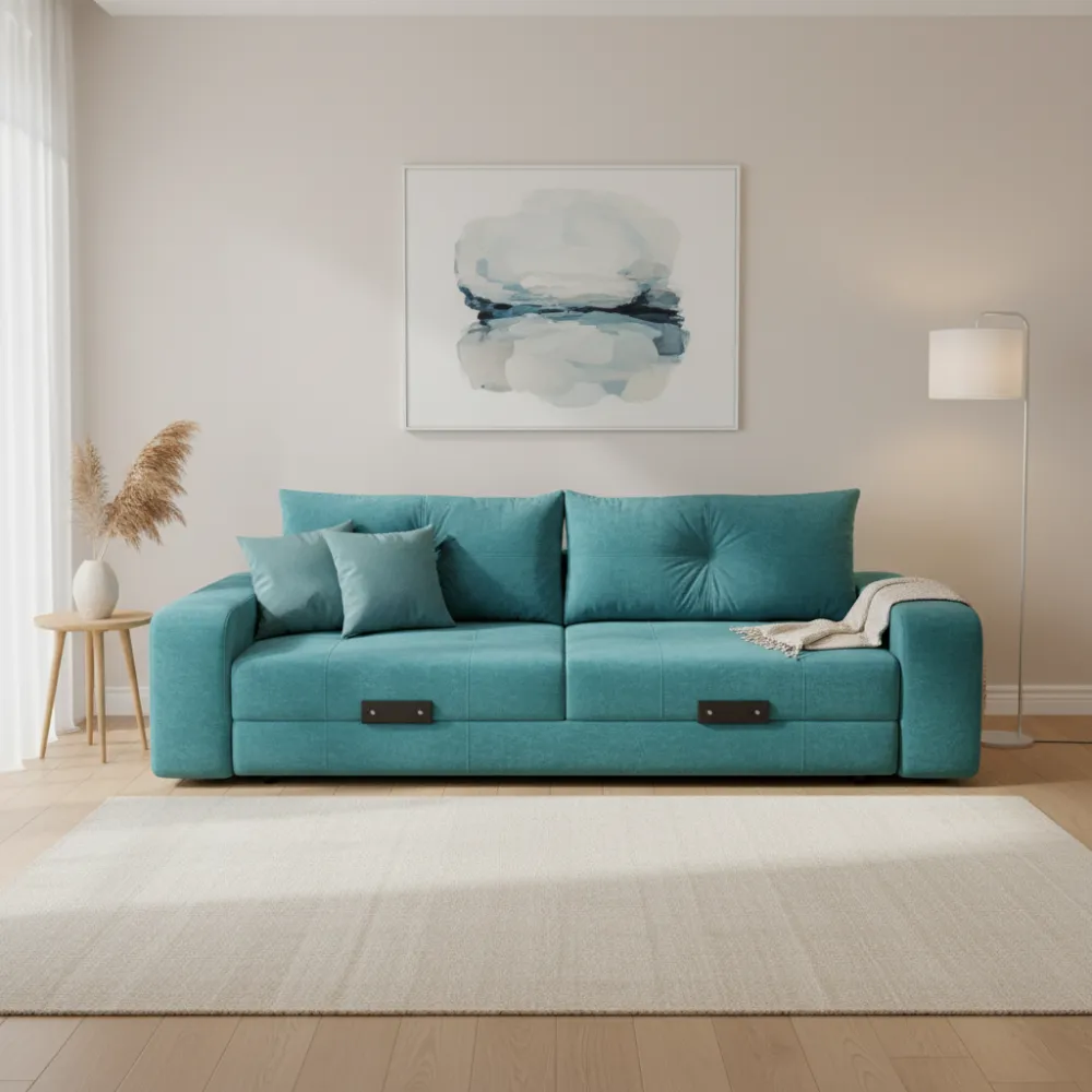 Материал обивки: Ткань. Обивка приятна на ощупь и устойчива к износу, что обеспечивает долговечность и лёгкость ухода. Цвет исполнения — бирюзовые — подчёркивает эстетичность модели.