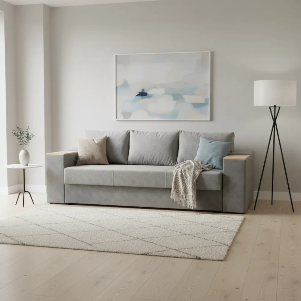 Материал обивки: Ткань. Обивка приятна на ощупь и устойчива к износу, что обеспечивает долговечность и лёгкость ухода. Цвет исполнения — серые — подчёркивает эстетичность модели.