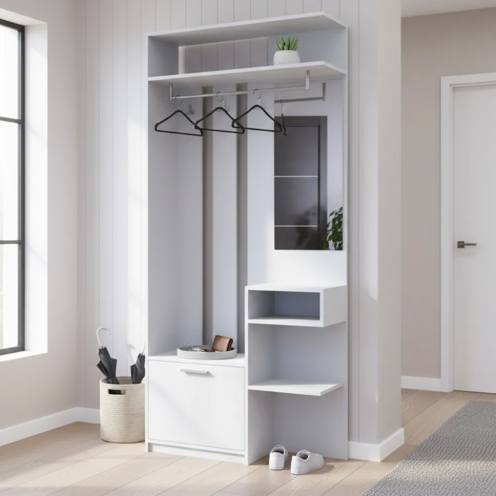 обеспечивает долговечность несмотря на низкую цену. Прихожая имеет удобную тумбу для обуви, полочки для вещей и место для верхней одежды.