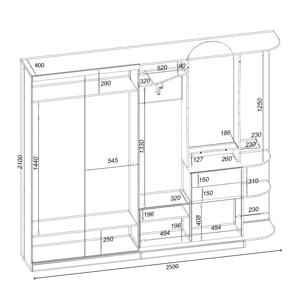 | Глубина, мм400 | Высота, мм2100 | Ширина, мм2500 |