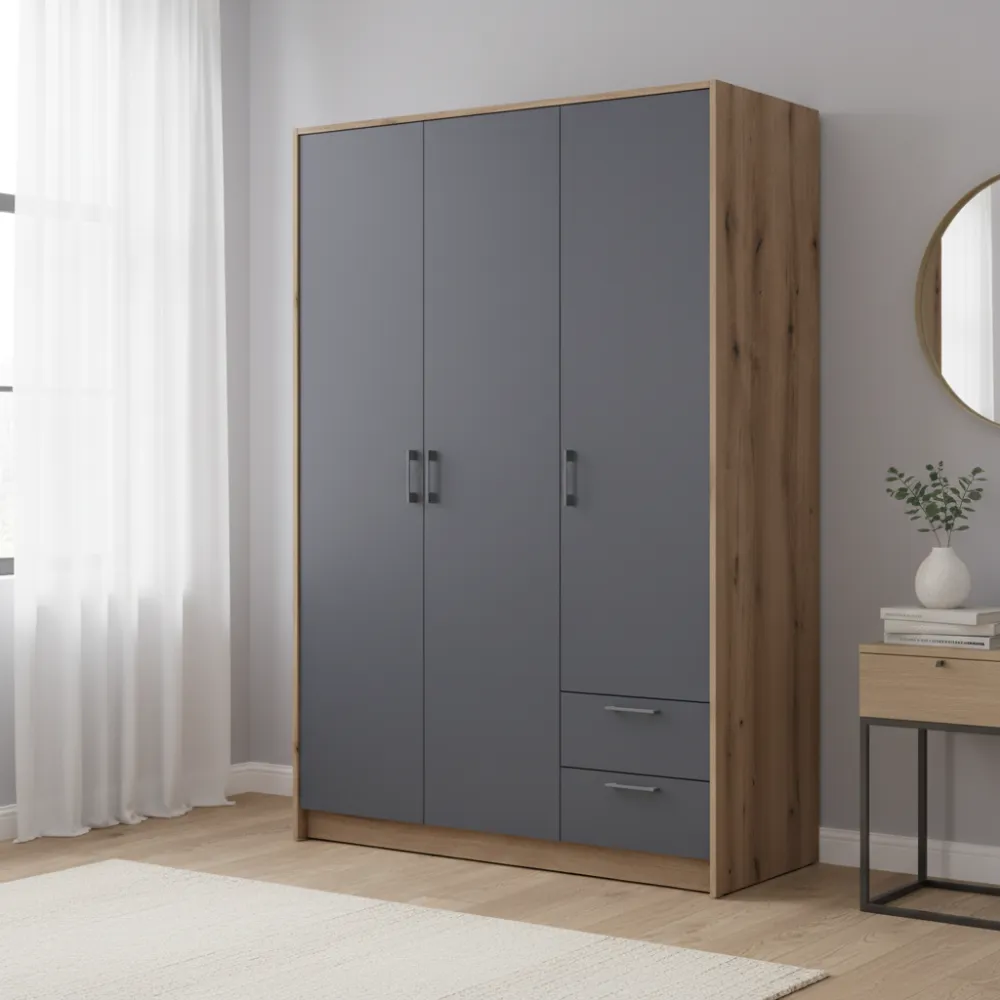 Распашные шкафы Ронди изготавливаются в нескольких комбинациях цветов: дуб артизан/графит и дуб артизан/кашемир.