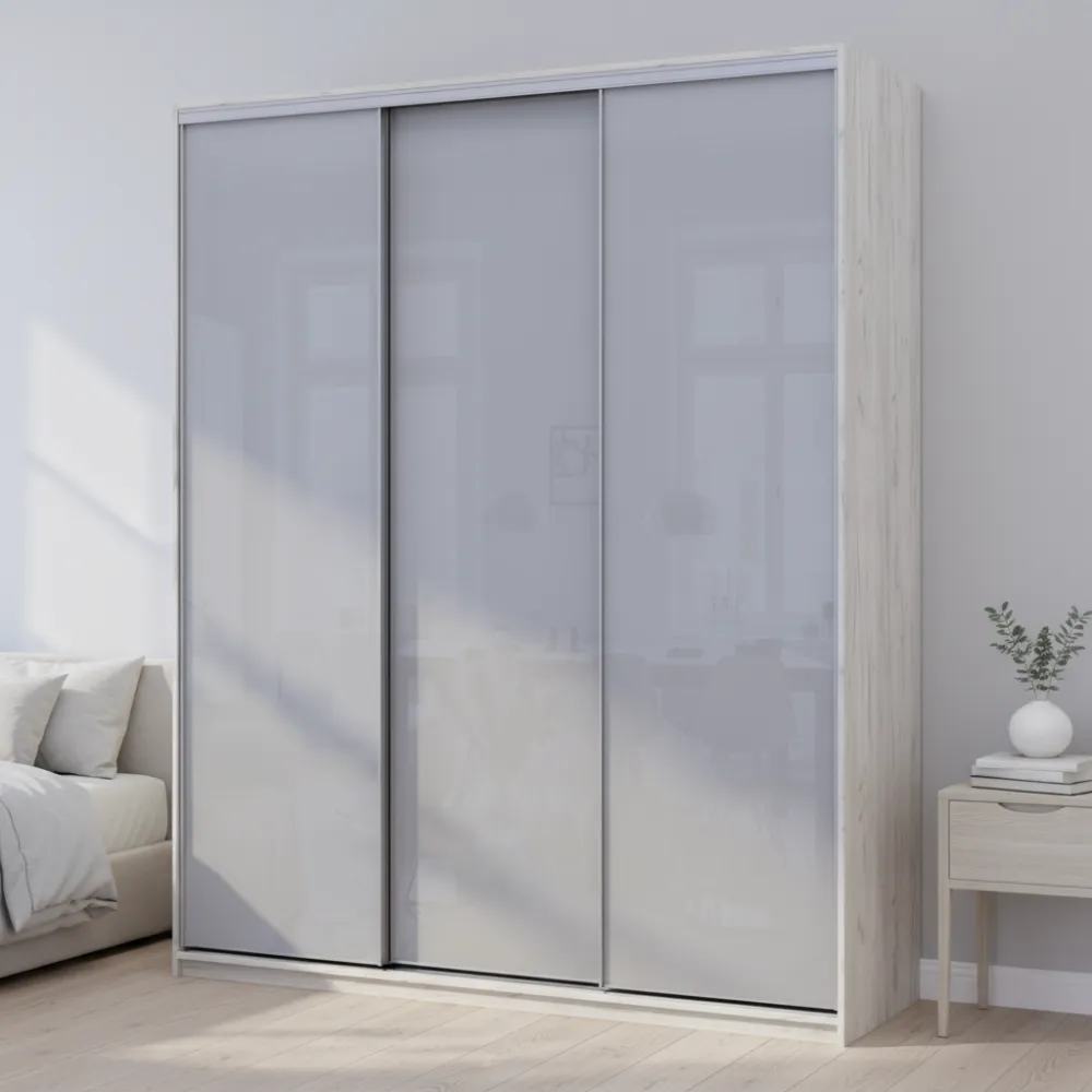 Шкафы изготавливаются в двух цветах корпуса: дуб сонома и белое дерево. Фасады шкафа: стекло белое, серое и черное в серебрянном профиле слим. Профиль комплектуется дополнительно уплотняющими щетками на фасадах.