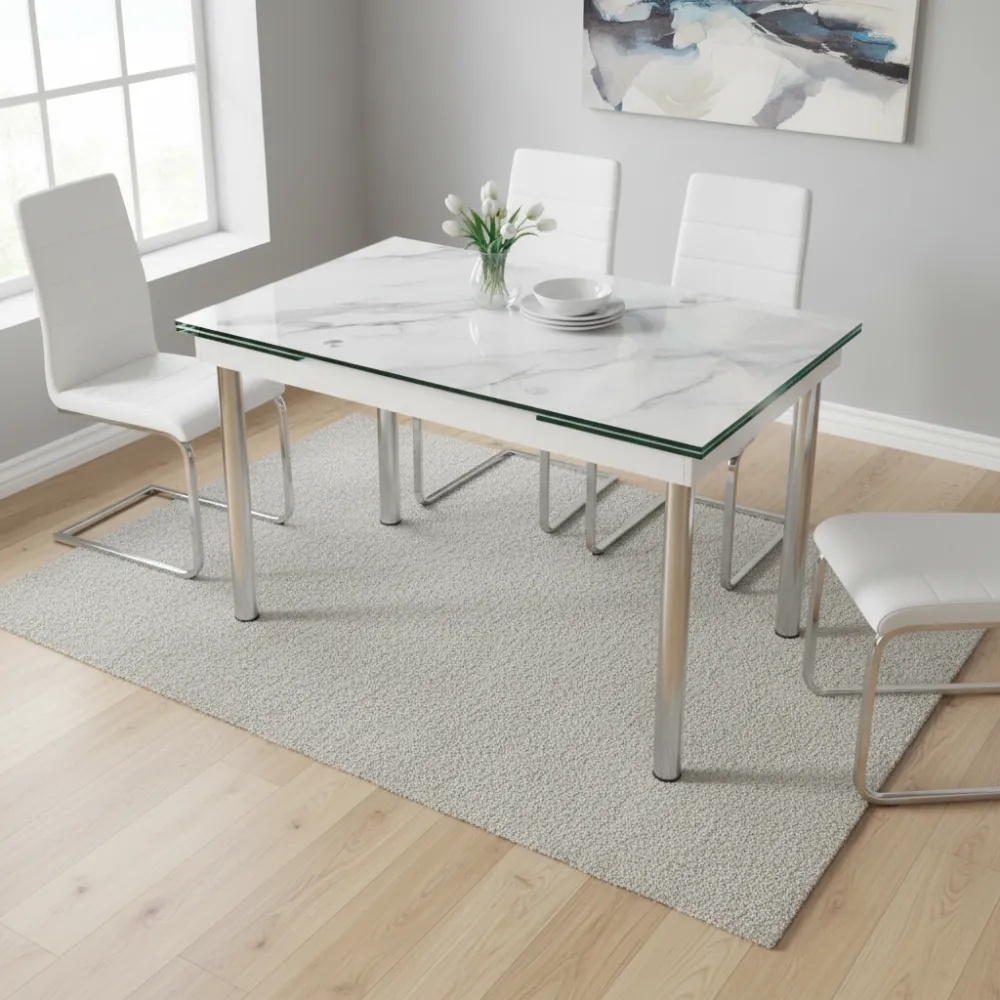Раскладной механизм: Удобная система трансформации позволяет быстро увеличить полезную площадь стола, делая его отличным решением для приёма гостей или семейных обедов.