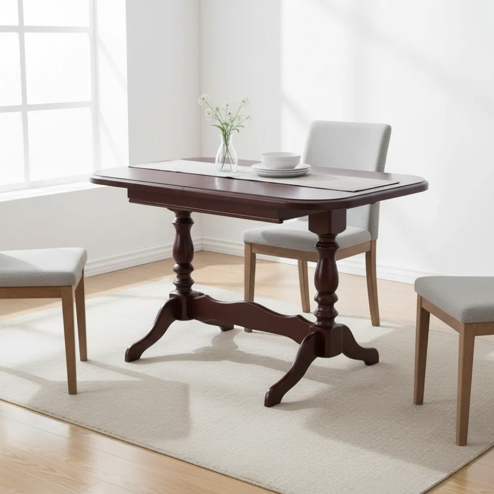 Раскладной механизм: Удобная система трансформации позволяет быстро увеличить полезную площадь стола, делая его отличным решением для приёма гостей или семейных обедов.