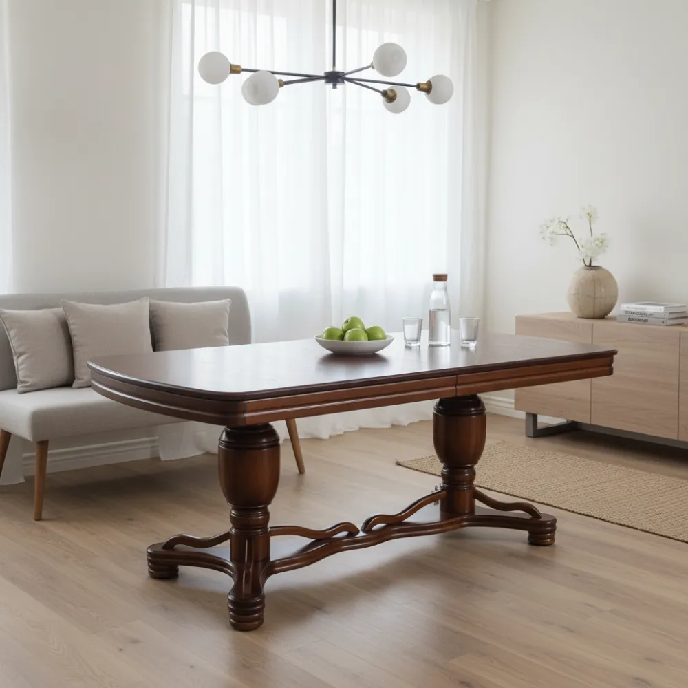 Раскладной механизм: Удобная система трансформации позволяет быстро увеличить полезную площадь стола, делая его отличным решением для приёма гостей или семейных обедов.