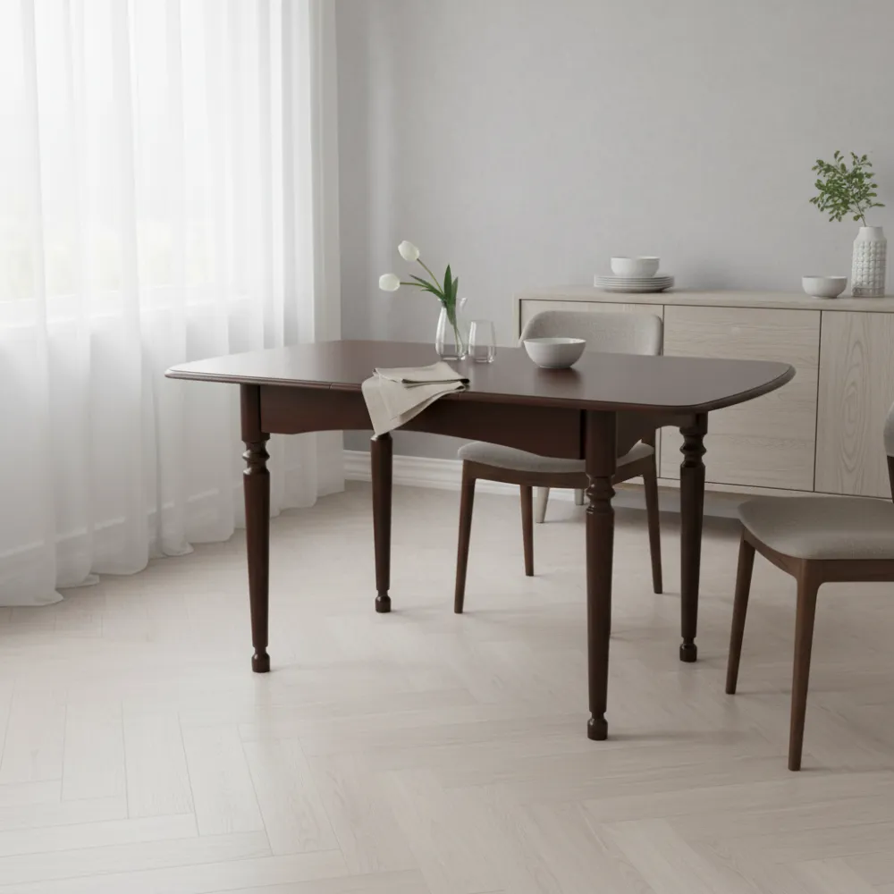 Раскладной механизм: Удобная система трансформации позволяет быстро увеличить полезную площадь стола, делая его отличным решением для приёма гостей или семейных обедов.
