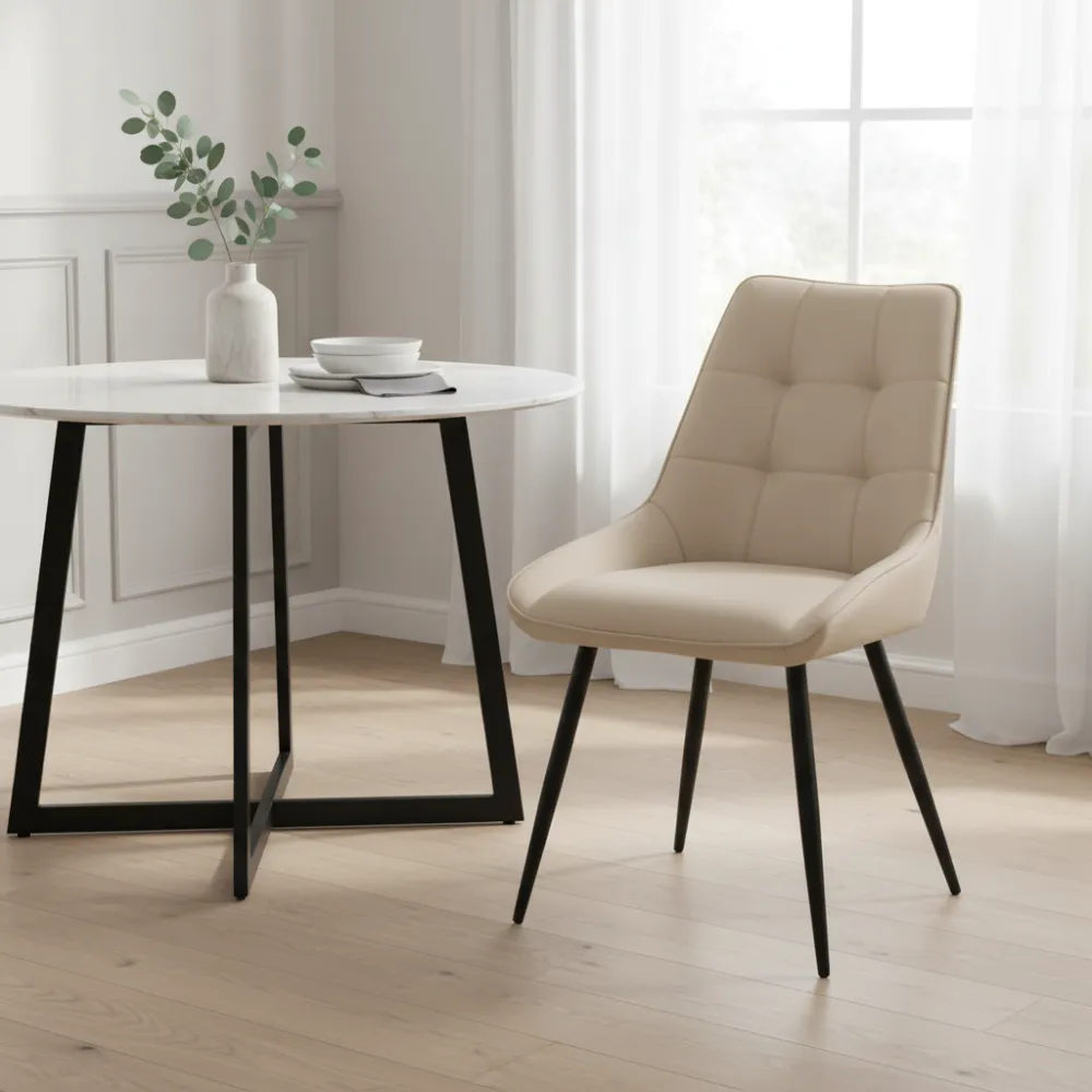 Цвет обивки "капучино" придает стулу мягкий и уютный вид. Этот теплый оттенок хорошо сочетается с различными стилями интерьера, особенно современными и скандинавскими, придавая им уют и изящность. кожзаменителя, который выглядит как натуральная кожа, но при этом более простой в уходе. Этот материал устойчив к загрязнениям и легко очищается, что особенно важно в повседневном использовании.