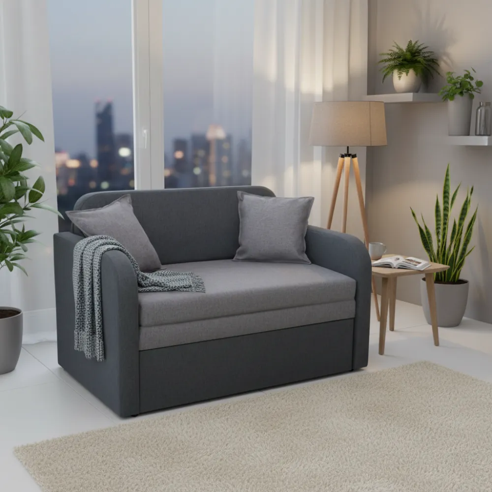 Характеристики:Ширина: 1270 мм; Глибина: 800 мм. Висота спинки: 800 мм; Висота підлокітників: 650 мм; Товщина підлокітників: 85 мм; Висота посадки: 450 мм; Ширина спального місця: 1100 мм; Довжина спального місця: 1950 мм Каркас: ДСП + ДВП + Дерево. Наповнення: Поролон 25-ї щільності товщиною 100 мм на ламелях. В комплект входить дві подушки розміром 40*40мм. Також є ніша для білизни.Матеріал оббивки в складській програмі (поєднання тканин) Мальмо 95/ Мальмо 90 ( Exim Textil)