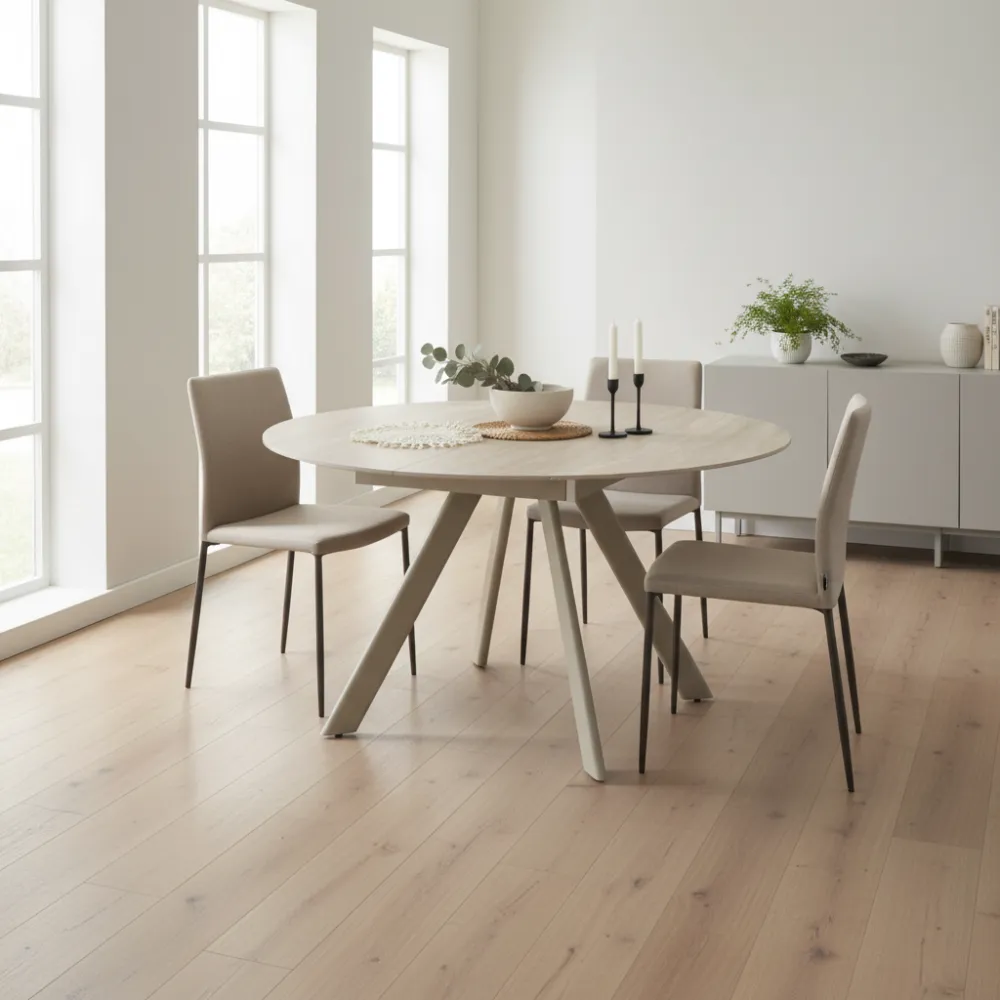 Стіл має круглу форму діаметром 135 см, що дозволяє комфортно розмістити сім’ю або гостей за обідом. Завдяки боковому механізму розкладки стіл легко трансформується, збільшуючи корисну площу для сервірування або проведення святкових подій. Оптимальна висота 76 см забезпечує зручність для людей будь-якого зросту, а міцні матеріали гарантують тривалий термін експлуатації навіть при щоденному використанні.