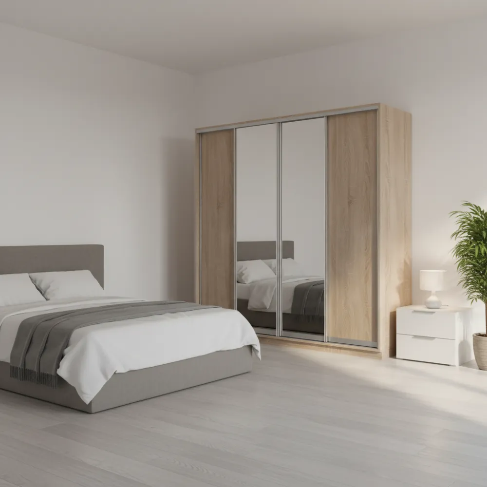 Шафа-купе E Line ШК 4.1 (2300х600х2400) - це чотиридверна шафа-купе з розсувною системою відкривання, розмірами 2300×600×2400 мм. Він чудово підійде для наступних приміщень: у спальню; у передпокій; у коридор; у вітальню; у дитячу; в офіс.