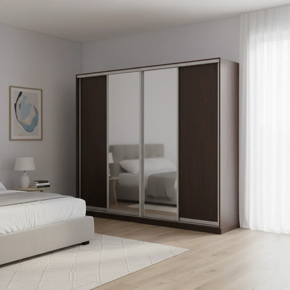 Шафа-купе E Line ШК 4.1 (2500х600х2400) - це чотиридверна шафа-купе з розсувною системою відкривання, розмірами 2500×600×2400 мм. Він чудово підійде для наступних приміщень: в офіс; у дитячу; у вітальню; у коридор; у передпокій; до спальні.