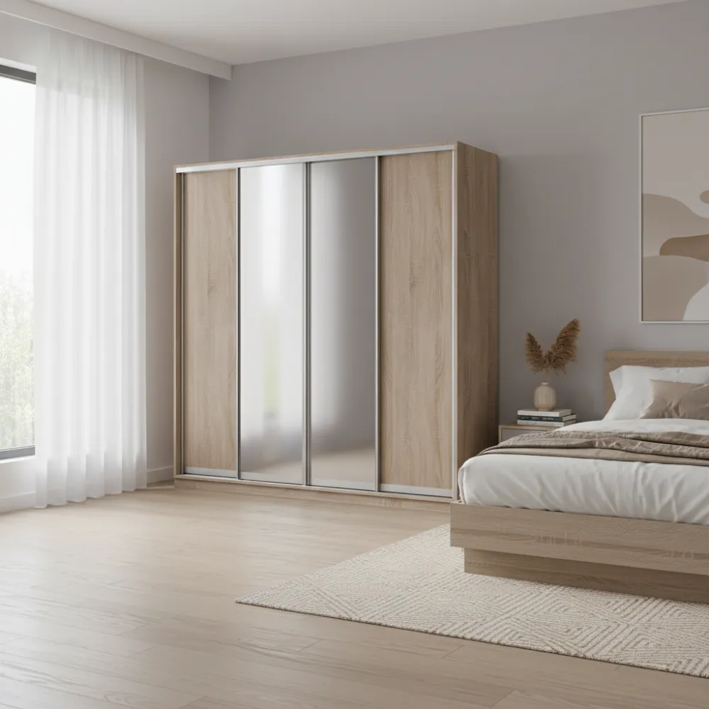 Шафа-купе E Line ШК 4.2 (2500х450х2400) - це чотиридверна шафа-купе з розсувною системою відкриття, розмірами 2500×450×2400 мм. Він чудово підійде для наступних приміщень: у спальню; у передпокій; у коридор; у вітальню; у дитячу; в офіс.