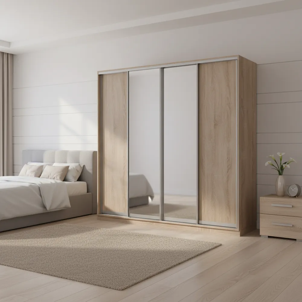 Шафа-купе E Line ШК 4.2 (2700х600х2400) - це чотиридверна шафа-купе з розсувною системою відкриття, розмірами 2700×600×2400 мм. Він чудово підійде для наступних приміщень: у спальню; у передпокій; у коридор; у вітальню; у дитячу; в офіс.