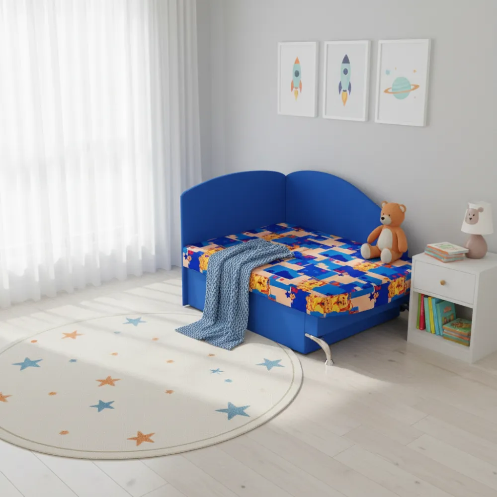 Дитячий диван “Антошка” – чудова модель для малогабаритних і дитячих кімнат. Стаціонарні спинки доповнені подушками з високоякісного пінополіуретану, які при розкладці формують спальне місце. Сторона кріплення бічної спинки взаємозамінна. При своїх компактних розмірах диван має повноцінне спальне місце 190х80 см і містку нішу для білизни.