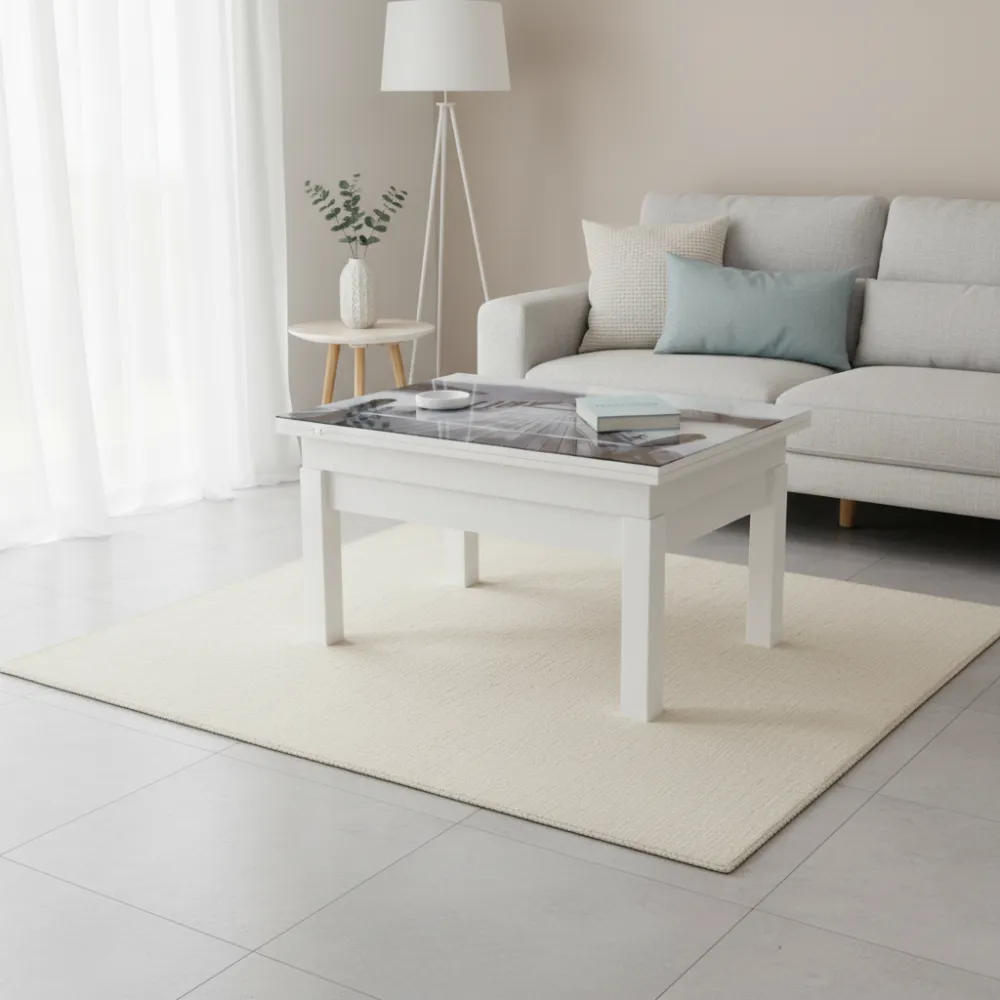 Розмір: Довжина 902 (1204), Ширина 602 (902), Висота 520 (750) Колір: Білий + скло Міст ( fp-1118) Матеріал: Ніжки: масив дерева; Столешня: ДСП Стіл-трансформер Флай від компанії МІКС Меблі - це чудове рішення як для невеликих приміщень так і для вітальних кімнат та дач. Займає в складеному виді дуже мало місця, але коли його розкласти, то він стає повноцінним обіднім столом. Його габарити: у складеному виді (ДШВ), мм 902 * 602 * 520, в розкладеному - 1204 * 902 * 750. Стільниця столу виготовлена з сучасного високоякісного ДСП, яке відповідає всім існуючим стандартам в Україні.Механізм трансформації виготовлений із квадрат-труби товщиною 16*16мм., пофарбованої порошковою фарбою, що дозволяє витримувати будь-які навантаження (в розумних межах). Механізм оснащений газовими амортизаторами та пружинами. Це сприяє м'якому підйому стільниці перед розкладкою. Опори столу виготовлені з екологічно чистих порід деревини.