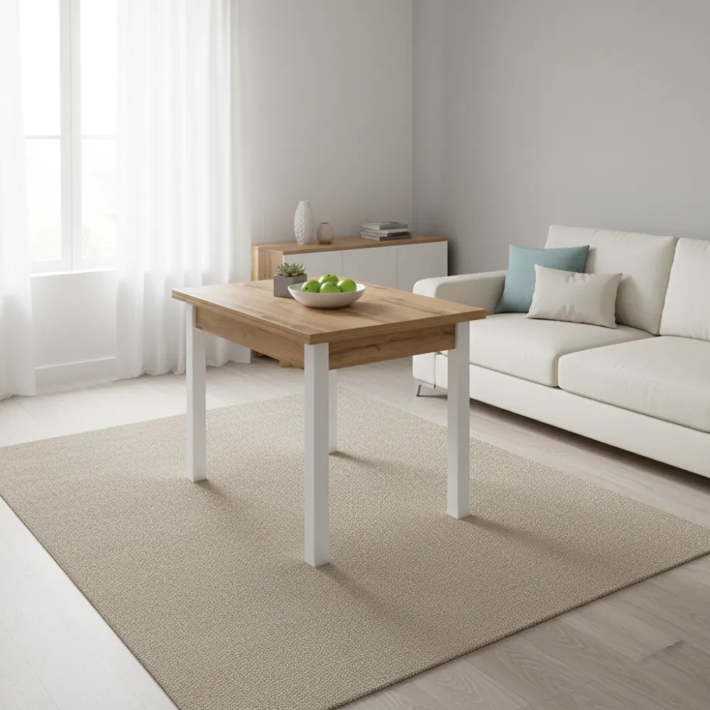 Розмір: Д*Ш*В: 900 (1200)*600 (900)*760 Колір: Каркас: Білий. Столешня: ДСП SWISSPAN дуб тахо, кромка - дуб тахо; Матеріал: Ніжки: Масив дерева; Столешня: ДСП ламіноване.