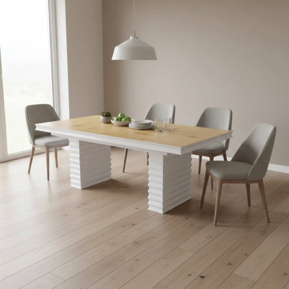 Розкладний механізм: Зручна система трансформації дозволяє швидко збільшити корисну площу столу, роблячи його чудовим рішенням для прийому гостей або сімейних обідів.