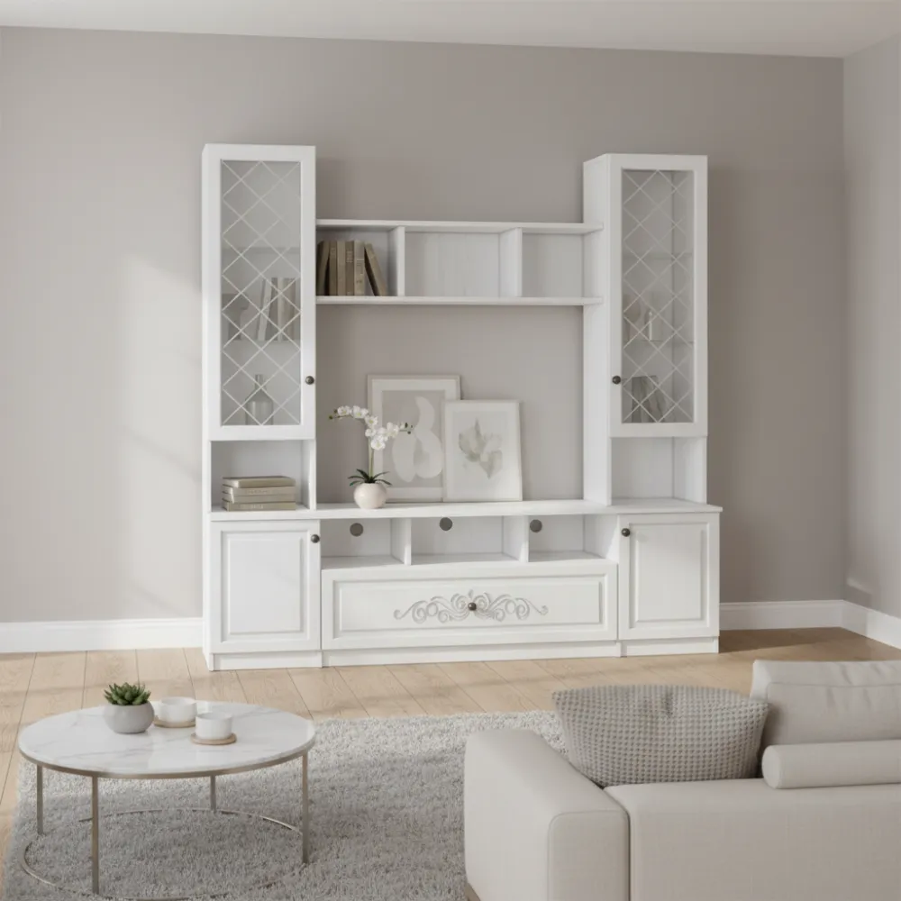 Беатріс БТ15 — класична вітальня довжиною 190 см, висотою 185 см, з глибиною 41,6 см. Білий фасад із елегантними деталями ідеально підійде для інтер'єру в стилі неокласика.