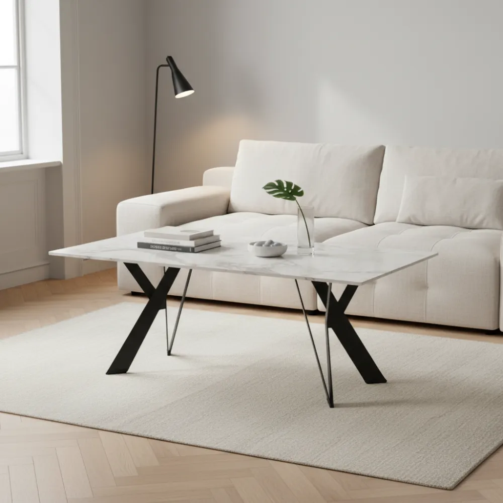 Столешниця виготовлена з глянцевої кераміки, яка надає столу блиск і шик, а також забезпечує легкість догляду та довговічність. Основа журнального стола виготовлена з фарбованого металу, що надає конструкції міцності та стабільності. Це поєднання матеріалів робить стіл не лише естетично привабливим, а й стійким до пошкоджень та довговічним.